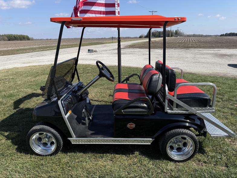 This golf cart has a black body, black/orange seats and an orange top, It has 2024 batteries. It has a new flip-down tinted windshield, and is street legal. It has a flip-down black/orange rear seat that is diamond plated. It has 215/35-12 custom wheels and tires. Charger included.