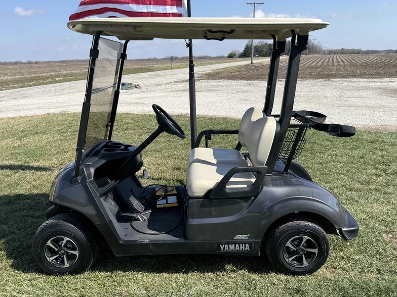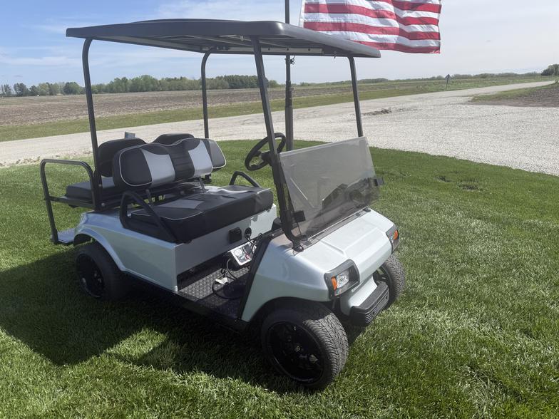 This golf cart has a gray body, black/silver seats and a black top, It has new batteries and cables. It has a new flip-down tinted windshield and a street-legal light kit. It has a flip-down white rear seat. It has 215/35-12 custom wheels and tires. Custom dashboard. Charger included.