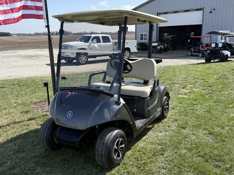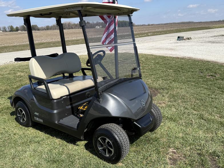 This golf cart has a metallic gray body, light gray seats and a light gray top, It has new Trojan batteries and cables. It has a new flip-down tinted windshield. It has SS hubcaps. Charger included.