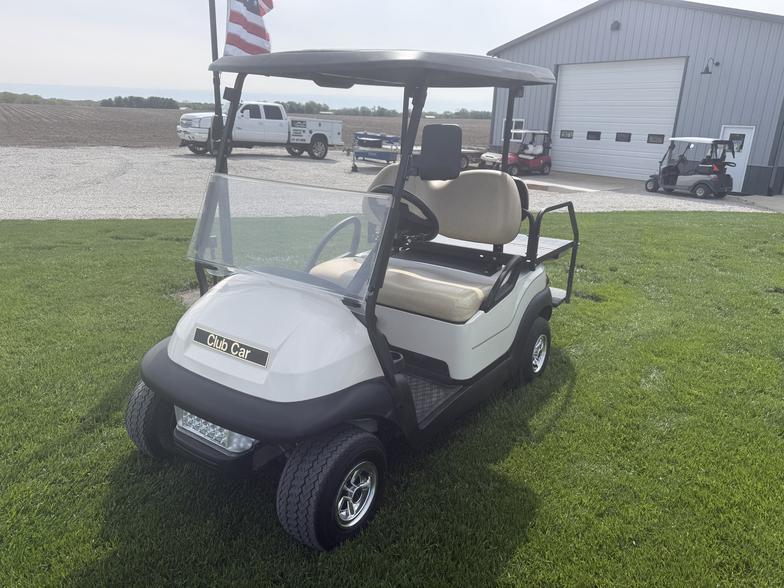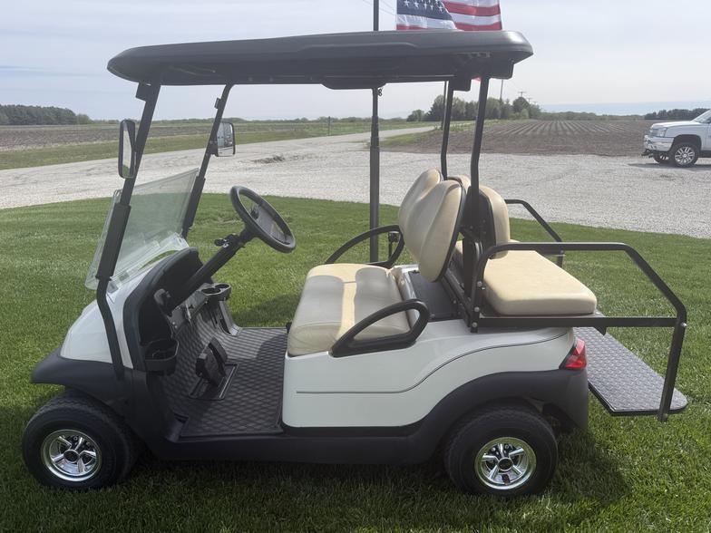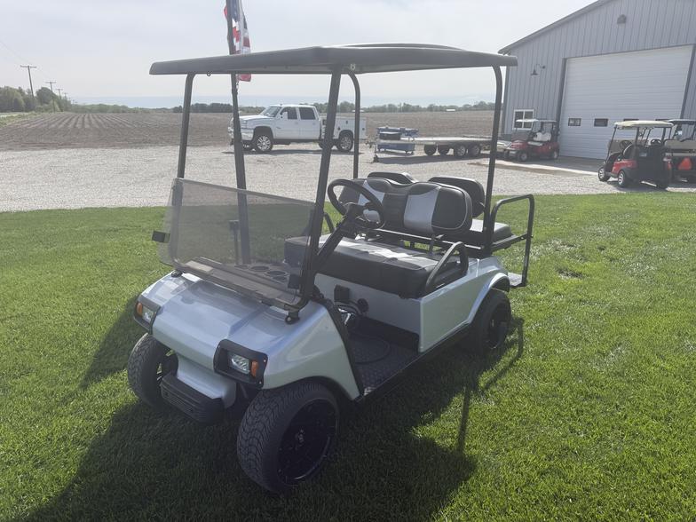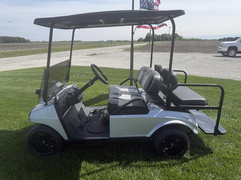 This golf cart has a white body, beige seats and a black top, It has a fuel-injected Kohler engine. It has a street-legal light kit and a flip-down windshield and rearview mirrors. It also has a flip-down rear beige seat. It has SS hub caps. It has been recently serviced.