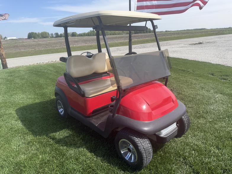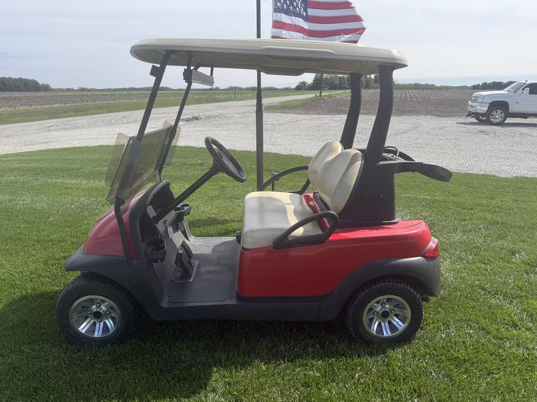 This golf cart is a factory refurbished golf cart. It has a new Club Car Red body, a new Club Car black top and new premium black seats, It has new Trojan batteries and cables. It has a new tinted windshield . It has new custom SS 205/50-10 wheels and tires. It has a battery watering system. It also has a USB port. This cart can be made street legal for an additional cost. Charger included.