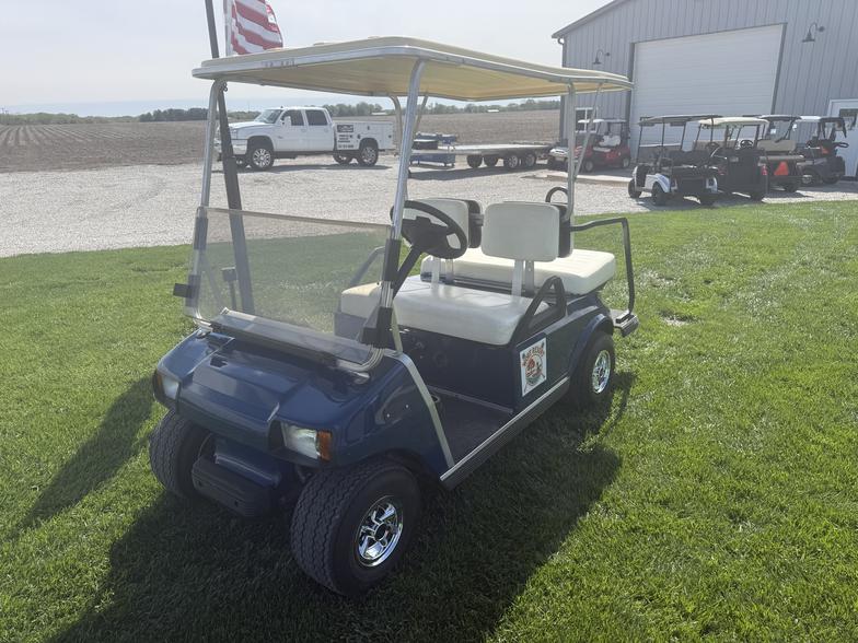 This golf cart has an Ice Blue body, black top and premium Club Car gray seats, It has new Trojan batteries and cables. It has a tinted windshield and is street legal. It has new custom SS 205/50-10 wheels and tires. It has a battery watering system. It also has a USB port. Charger included.