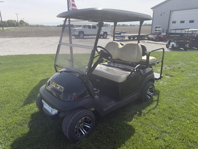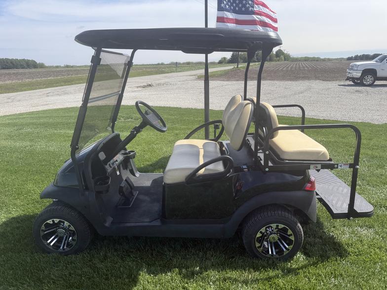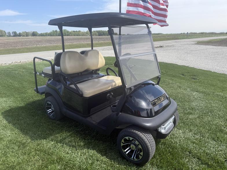 This golf cart has a new Club Car black body, beige seats and a black top, It has a fuel-injected Suburu engine. It has a street-legal light kit and a new flip-down windshield. It also has a new flip-down rear beige seat and a USB port. It has new 205/50-10 custom wheels and tires. It has been recently serviced.