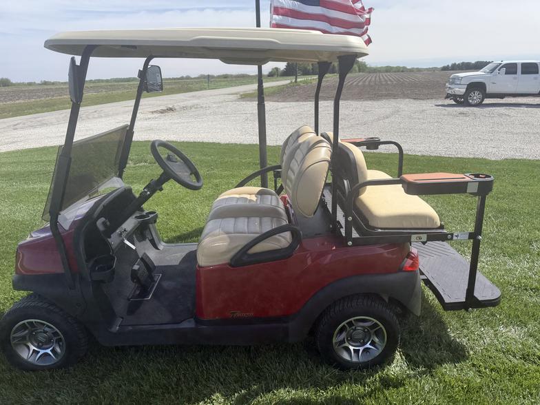 This golf cart has a new Red body, black top and premium Club Car gray seats, It has new Trojan batteries and cables. It has a new rear flip seat. It has a tinted windshield and is street legal. It has new custom SS 205/50-10 wheels and tires. It has a battery watering system. It also has a USB port. Charger included.