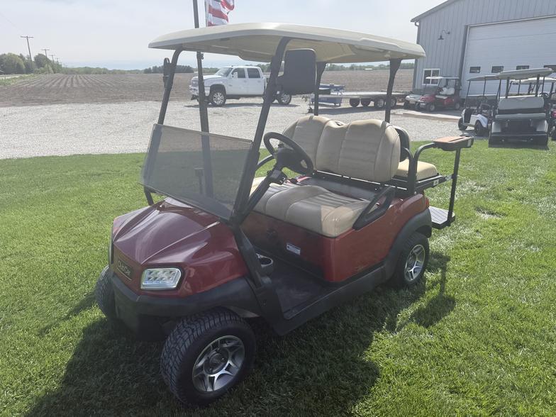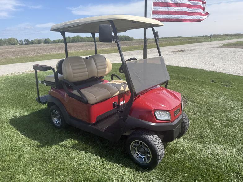 This golf cart has a red body, premium Club Car beige seats and a beige top, It has new Trojan batteries and cables with a battery watering system. It has a street-legal light kit and a rear flip-down beige seat. It has a flip-down tinted windshield, rearview mirrors and USB ports. It has Club Car 205/50-10 aluminum wheels and tires. Charger included.